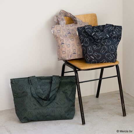 使いやすい落ち着いた色合いの、ミッフィーの総柄がかわいいエコバッグ。くるりと折りたたんでお買い物にもお出かけのサブバッグにもおすすめ。ファスナー付きでお出かけにも安心の仕様で仕上げました。