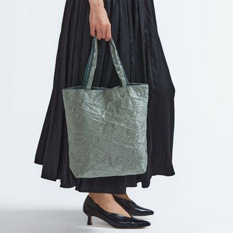 ツヤのあるナイロン素材に、ランダムなシワ感が出るような加工を施しています。