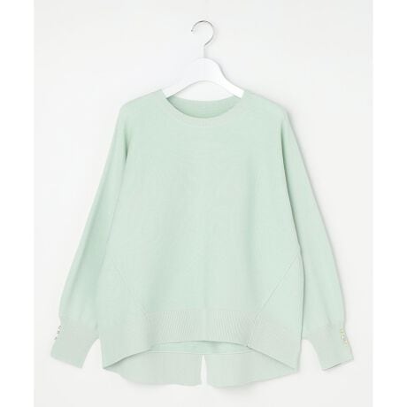 ・オンオフ着回しのしやすいきれいめドルマンニット・襟元の開き加減も程よく上品な印象・前後差のある着丈でインもアウトも決まりの良いデザイン・後ろ裾のスリットと袖口のボタンがさりげないポイントに