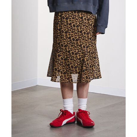 ドット柄とレオパード柄を楽しめる、春ムード漂うミディ丈スカート
