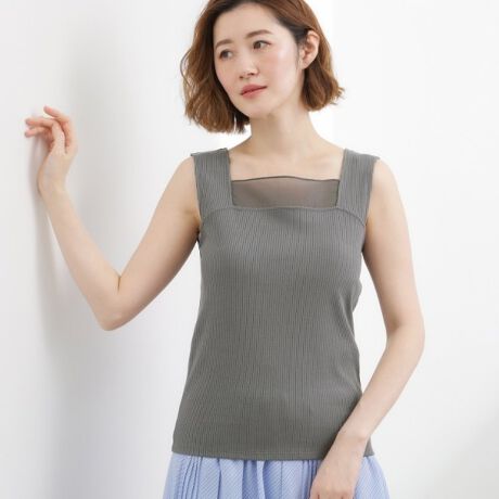 スクエアネックにシアー素材をさりげなくあしらい、シンプルながらも遊び心のあるデザイン。