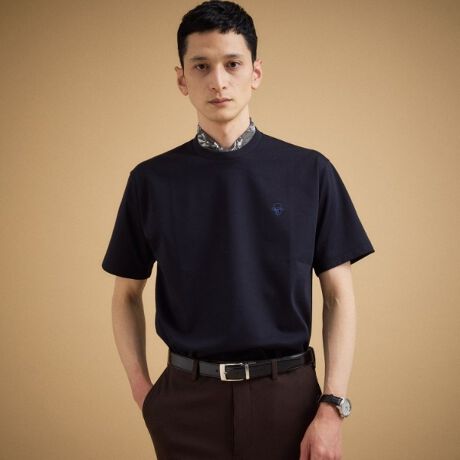 ブランドのクリエイティブディレクター・菊池武夫氏を一筆書きで表現した、遊び心あふれるモチーフ刺繍を胸元に配したワンポイントTシャツ。