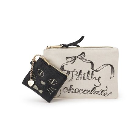 オシャレなパッケージを合皮にプリントし、バッグチャームにもなるミニポーチとキャンバス素材にアートをプリントした異素材セットポーチ。