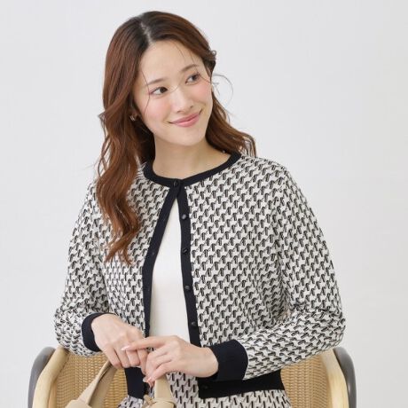 3配色の幾何柄が印象的なクルーカーディガン。