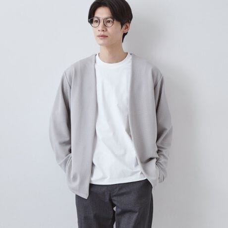 カーディガンには、細かいふくれ感のあるジャカードカットソー素材を使用。