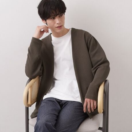 カーディガンには、細かいふくれ感のあるジャカードカットソー素材を使用。