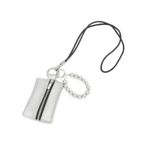 小さなジップポーチにメタリックハンドストラップがセットになったチャーム。