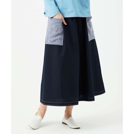 コットンリネンの強撚タイプライター素材を使用した、4枚接ぎのAラインスカートです。ウエスト部分と両脇のポケットには、コットンリネン×シルクネップ糸のニットで配色デザインをあしらい、さりげないアクセントに仕上げました。