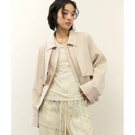 大人っぽいステンカラーや、やや太めに設定した袖幅に対してのショート丈のバランスが魅力。