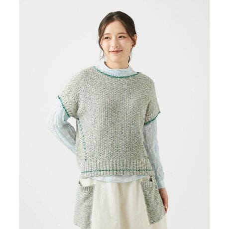 凹凸のある糸を使用し、表情豊かな素材感を楽しめる丸首ベストです。身頃は鹿の子編みで仕立て、脇部分には裏目編みを取り入れることで、編地の切り替えによる立体感とさりげない変化を加えています。衿の配色デザインや脇部分のハンドステッチがアクセントとなり、色使いと手仕事の温かみが感じられる、他にはない一枚に仕上げました。
