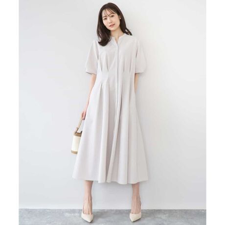 長さのある半袖デザインで一枚で決まるワンピース。ウエストのタックでメリハリをつけつつ、体から離れたシルエットで涼しげに着用できます。