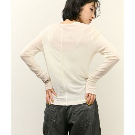 右身頃はリブ、左身頃は天竺と素材のコントラストをつけたシアーロンT。