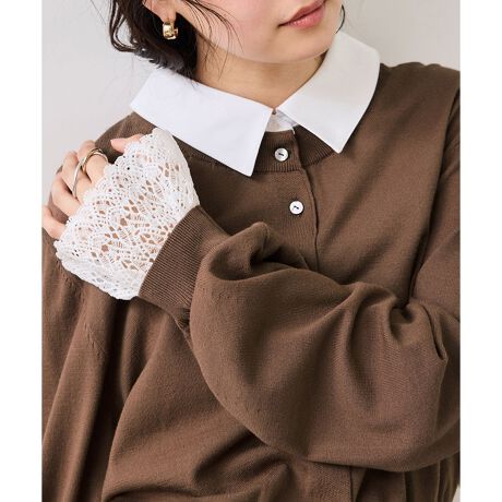 1枚でスタイリングが完成させるシャツ襟とレース袖がドッキングされているニットトップス。
