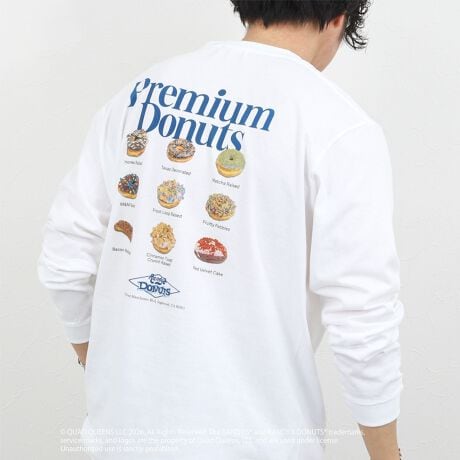 1952年にロサンゼルスで創業した大人気ドーナツ店。フロントはシンプルなロゴデザイン、バックには実際のメニューをモチーフにしたドーナツプリントを大胆に配置したデザイン。