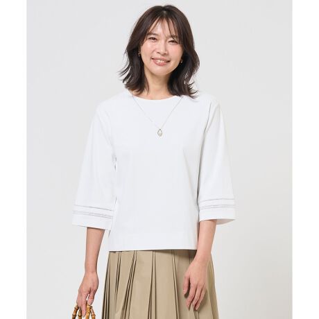 ■デザイン軽やかなフレア袖が女性らしさを引き立てる、7分袖のカットソー。二の腕を優しくカバーしながら、上品な抜け感のあるデザインに仕上げました。袖口には、繊細な幾何柄レースをあしらい、さりげない華やぎをプラスしました。1枚で着映えし、ジャケットやカーディガンのインナーとしても活躍してくれます。デイリーにはもちろん、オフィスカジュアルにもスタイリングを楽しめるアイテムです。カラーは、清潔感あふれる上品なホワイト(#001)、肌なじみが良く落ち着いた印象のベージュ(#033)、爽やかで洗練されたライトアクア(#072)の3色の展開です。