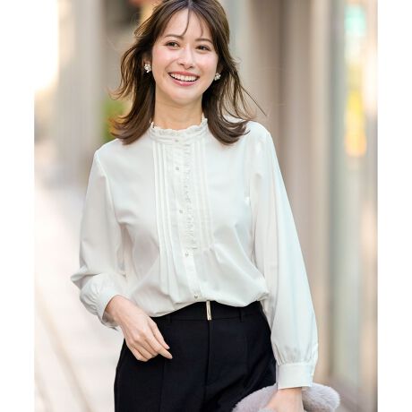 ・フリル襟が前立てまで繋がった華やかで着映えする一枚・前身頃にあしらったピンタックがジャケット合わせの胸元を華やかに演出・小粒のパール調ボタンが女性らしいアクセント・シャツテールカットでボトムインしやすく、アウトでもきれいなシルエット・ニットとのレイヤードにもぴったりな程よいサイズ感