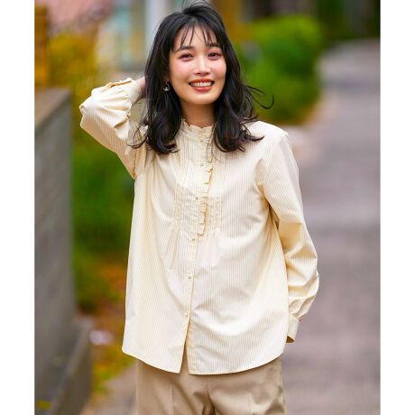 ・フリル襟が前立てまで繋がった華やかで着映えする一枚・前身頃にあしらったピンタックがジャケット合わせの胸元を華やかに演出・小粒のパール調ボタンが女性らしいアクセント・シャツテールカットでボトムインしやすく、アウトでもきれいなシルエット・ニットとのレイヤードにもぴったりな程よいサイズ感