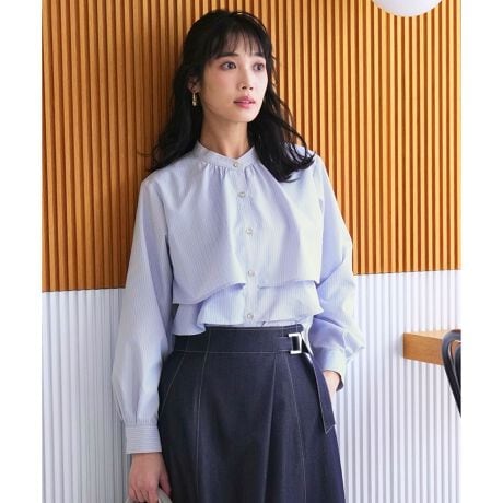 ・人気のラッフルレイヤードブラウスの新作・アウトで着た時にコンパクトできちんと感のある仕上がり・ティアード部分の分量を調整し、より自然で美しいボリューム感に・立体的なラッフルティアードデザインと金縁ボタンが上品で可愛いシャツブラウス・1枚でもジャケットインでも着やすく、オンオフで使える万能アイテム・シャツテールカットでボトムインしやすく、アウトでも美しいシルエット・ウエストインもきれいに決まるティアード位置・羽織りアイテムとしても使え、着回し力抜群・爽やかなストライプ柄と大人可愛いドット柄、どちらもスタイリングの主役になる一枚