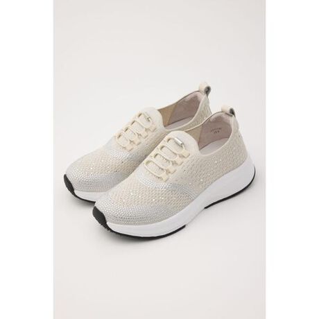 新作ニットスリッポンが登場!軽量EVAソールで弾力とグリップ感があり、軽やかな履き心地です。レースアップ風のデザインに、足元のラインを綺麗に魅せるよう大小ストーンの配置にもこだわり、さらにラメ混の編地にも凝っています。つま先・甲部分・側面で編み方を変え、凹凸のある表情感があるのも特徴。かかと部分にもクッションが入っており、しっかり目の詰まったニット素材のため、フィット感がありながら窮屈感を感じにくいのも優秀ポイントです。