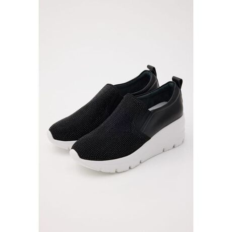 [型番:350JS149-9235]脚長効果も叶う人気のハイヒールスリッポンに、新デザインがお目見え。煌びやかな極小ラインストーンとレザーを組み合わせたコンビデザインです。軽量で高低差も少なく、プラットフォームのような軽やかな履き心地。ホワイトソールが重たすぎず、スタイリングを軽やかに魅せてくれます。カジュアルにもきれいめなコーディネートにも重宝する一足です。
