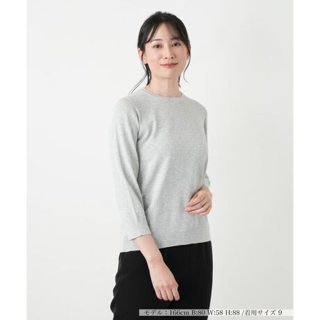 コットン、アセテート、ナイロンをブレンドした、清涼感のあるドライな肌触りのクルーネックニットプルオーバー。春先に最適なやや薄手のニットながら、細やかなハイゲージ編みによりクリーンな佇まいに仕上げました。手元を軽やかに演出する七分袖は、一枚着としてはもちろん、ジャケットのインナーとしても美しく収まります。伸縮性に優れたストレスフリーな着心地と、装飾を削ぎ落としたミニマルな表情が、洗練された大人の日常に寄り添うアイテムです。
