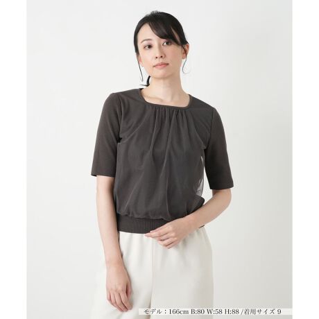 フロントに重ねた繊細なチュールが柔らかなニュアンスを添える、「BOURGE」のニットトップス。広めに開いたネックラインがデコルテを美しく引き立て、五分袖のシルエットが手元にエレガントな抜け感を演出します。やや薄手ながらしなやかな伸縮性を備えているため、身体に優しくフィットしつつストレスフリーな着心地を実現。裾のリブが全体を端正にまとめ、一枚着でもインナーでも品良く映える洗練された佇まいに仕上げました。