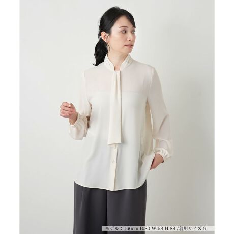 柔らかなとろみのあるしなやかな風合いの生地が、ストレスフリーな着心地を叶えるボウタイブラウス。無駄な装飾を省いてクリーンで上質感のある佇まいに仕上げました。首元には着脱をスムーズにするスナップボタンを配し、機能性と美しさを両立。取り外せないタイプのボウタイは、結ぶだけで顔周りに華やかなアクセントを添え、洗練された大人の表情を演出。一枚着としてはもちろん、ジャケットのインナーとしても装いを引き立てるアイテムです。
