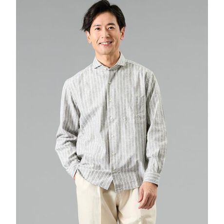 ジャカード織りで表現した繊細な柄にストライプを重ねた、ハイブリッドなデザインが特徴。首元をすっきり見せるカッタウェイカラーは、ノーネクタイでも美しく決まり、ジャケットスタイルにも好相性です。スラックスで上品に、チノやデニムで程よく崩した着こなしもおすすめです。