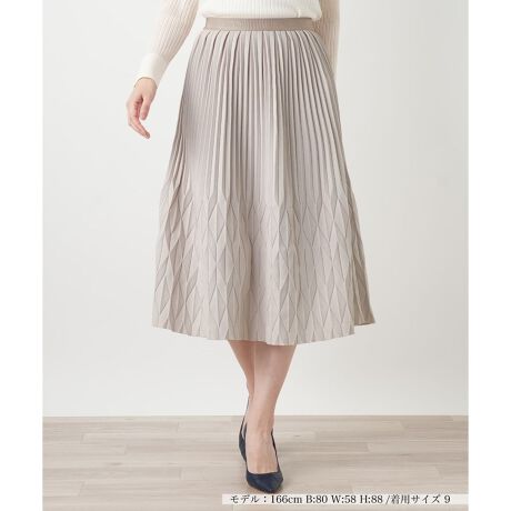 繊細なプリーツと切り替えのアーガイル織柄が、装いに奥行きと知的な印象を添えるミディ丈スカート。春の光に映えるやや薄手の生地感で動くたびに優雅な揺れを演出します。全体に伸縮性を持たせつつ、ウエストは総ゴム仕様を採用し、リラクシーでストレスなく過ごせる穿き心地にもこだわりました。端正な美しいシルエットも相俟って、カジュアルからきれいめまで幅広いコーディネートを品良くまとめ上げる一枚です。