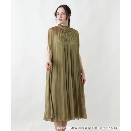 首元にあしらわれた細やかなフリルが、顔まわりに華やかな表情と優雅な印象をもたらします。肩から流れるように広がる縦長のプリーツは、ケープのような美しいドレープと、しなやかな動きを作り出し、奥行きのあるシルエットを演出。軽やかな素材が身体のラインを拾いすぎず、歩くたびに優雅に揺れる姿が魅力です。背面のネックラインにはさりげない開きがデザインされており、着脱のしやすさも兼ね備え、上品な佇まいを演出する一着です。