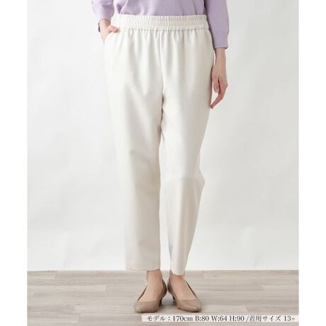 ミニマルなデザインで着回し力に優れた、シンプルな無地のパンツ。伸縮性に富んだ素材を使用しており、動きやすくストレスフリーな穿き心地を実現しました。ウエストはゴム仕様のため、長時間の着用でもリラックスしてお過ごしいただけます。すっきりとしたシルエットは、どんなトップスとも相性が良く、ワードローブの定番として活躍してくれる一本です。