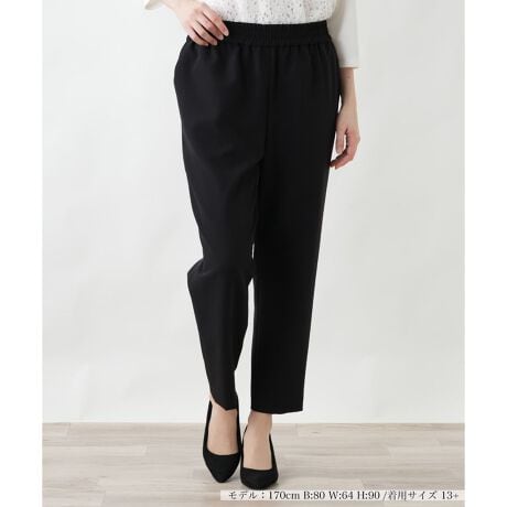 ミニマルなデザインで着回し力に優れた、シンプルな無地のパンツ。伸縮性に富んだ素材を使用しており、動きやすくストレスフリーな穿き心地を実現しました。ウエストはゴム仕様のため、長時間の着用でもリラックスしてお過ごしいただけます。すっきりとしたシルエットは、どんなトップスとも相性が良く、ワードローブの定番として活躍してくれる一本です。