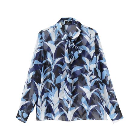 北陸産のシフォン素材に京都でプリントを施した、軽やかなボウタイブラウスです。植物のモチーフを線で描き、柄を重ねることで奥行きのある幾何学調のデザインに仕上げました。