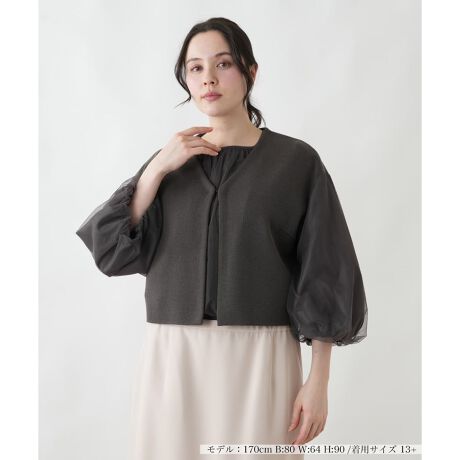 異なる素材の切り替えが特徴のショートカーディガンです。身頃は適度なハリ感のある生地で仕立てられ、すっきりとしたVネックラインが顔まわりに洗練された印象をもたらします。袖には透け感のある軽やかなシアー素材を使用し、ふんわりとしたボリュームスリーブが優雅な表情を演出します。袖口に施された細やかなギャザーが、手元にフェミニンなアクセントを添え、全体のデザインに奥行きを与えています。短めの着丈は、幅広いボトムスと好相性で、上品ながらも現代的な抜け感のある着こなしを叶える一着です。