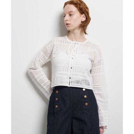 LANVIN en Bleuらしい遊び心のあるレース柄が、大人のフェミニンさを演出するカーディガン。トレンドのクロップド丈は、ハイウエストのパンツやワンピースに羽織るだけでスタイルアップが叶います。透け感を活かしたレイヤードや、リボンをチョーカー風にするなど、気分に合わせて軽やかな着こなしを楽しんで。