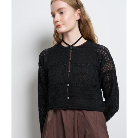 様々なパターンのレース柄をニットで編み上げた、繊細でレディな印象のニットカーディガン。