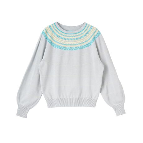 春らしい柔らかな色彩のフローラルヨーク柄が、顔周りを華やかに彩るクルーネックニット。