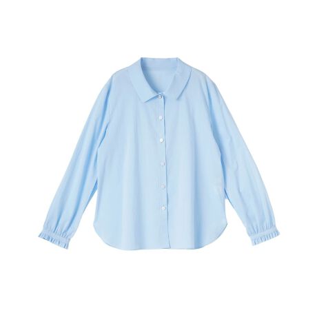 丸襟のギャザーが柔らかな印象を与える前立ての配色カン止めをポイントにした長袖シャツ。
