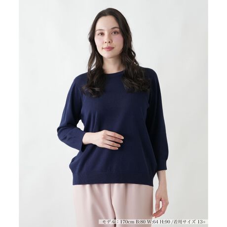 ジャケットなどのインナーに最適な、七分袖のニットインナーです。すっきりとしたノーカラーの丸首デザインは、どんなネックラインのアウターとも相性が良く、デコルテを美しく見せてくれます。手元に軽やかな抜け感を演出する七分袖もポイント。春先のコーディネートのベースとして、一枚持っていると大変重宝するアイテムです。