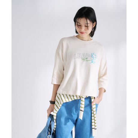 胸元にあしらわれた「LEAFS」のロゴと、花のグラフィックプリントが目を七分袖トレーナー。