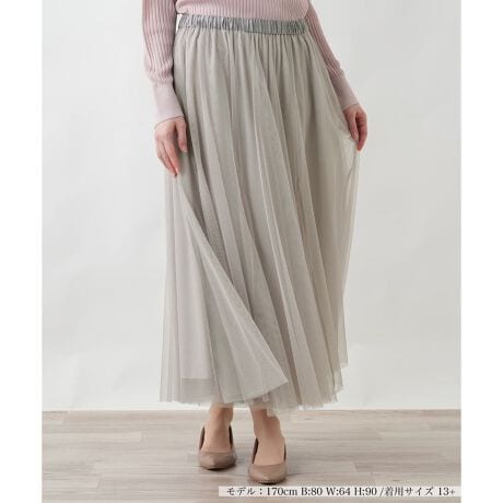 繊細で透け感のあるチュール生地を贅沢に重ね合わせることで、空気を含んだような軽やかなボリューム感と、奥行きのある色彩のニュアンスを実現しています。ウエストから裾に向かってたっぷりと施されたギャザーが生み出す縦のラインは、静止時にはすっきりとした落ち感を見せつつ、動きに合わせてふわりと広がり、優雅でドラマティックなドレープを描きます。ウエスト周りは幅広のシャーリング仕様で丁寧に仕立てられており、腰元に心地よくフィットしながらギャザーの起点となり、トップスをインした際にも洗練されたアクセントとして機能します。内側の生地とチュールの重なりによって生まれる裾の透け感が、足元に軽快な抜け感とフェミニンな柔らかさを添え、日常の装いを上品に彩る一着です。