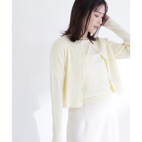 カーディガンと半袖プルオーバーのアンサンブルセット。カーディガンはリブ編みですっきりとさせ、身幅から裾へすとんと落ちるボクシーなシルエットで、様々なボトムスと合わせやすいです。インナーのプルオーバーは襟ぐりと袖口にシアーラインを入れて、抜け感と軽やかさをプラス。SETでもきちんと決まり、それぞれ単品でも着回しができる汎用性の高いアイテムです。<素材>キレイな目面ながら、綿混の春夏らしいタッチの糸を使用。カーディガンはリブ編み、インナーは天竺編みで編み立てています。インナーの襟ぐりと袖口にはきらっとシアーな糸を切り替えています。<詳細>仕様・カーディガンは前ボタン、インナーは開閉なし裏地・なし透け感・なし / 光沢・なし / 伸縮性・あり生地の厚さ・普通※モデルの着用画像の場合、光の当たり具合により、実際の色味と異なって見えることがございます。色味は、商品単体の画像をご参照ください。