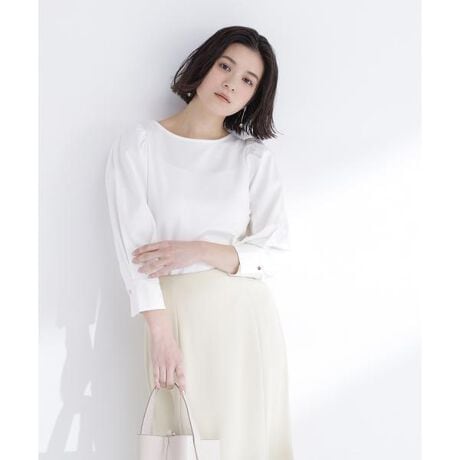 カットソー素材を使用したパフスリーブデザインのトップス。すっきりとしたボートネックに、構築的でフォルム感のあるパフスリーブデザインが特徴です。程よくコンパクトなボディなので、ボトムスにタックインするのがおすすめ。オフィスシーンからデイリーまで着回せます。<素材>キレイな表面感のセミシルケットポンチカットソー素材を使用しています。<詳細>仕様・開閉なし裏地・なし透け感・なし / 光沢・なし / 伸縮性・あり生地の厚さ・普通※モデルの着用画像の場合、光の当たり具合により、実際の色味と異なって見えることがございます。色味は、商品単体の画像をご参照ください。