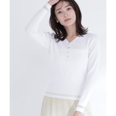 メタルのスクエアボタンがさりげないポイントのVネックニット。異素材のボーダーラインを組み合わせて上品な表情をプラスします。シンプルながらデザイン性があり、着回し力も抜群。通勤オフィスシーンにも取り入れやすいキレイめな一枚です。<素材>伸縮性があるハイゲージリブ編み、シャリ感もある素材を使用しています。<詳細>仕様・後ろボタン裏地・なし透け感・なし / 光沢・ややあり / 伸縮性・あり生地の厚さ・普通 ※モデルの着用画像の場合、光の当たり具合により、実際の色味と異なって見えることがございます。色味は、商品単体の画像をご参照ください。
