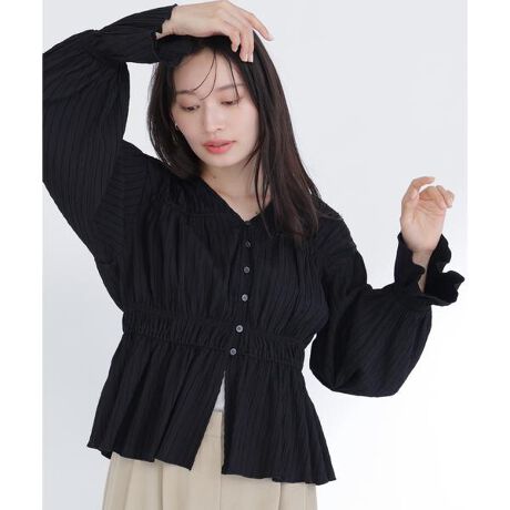 デコルテをキレイに見せてくれるVネックデザインのギャザーブラウス。ティアードシャーリングが程よく体にフィットしつつ、ふんわりと女性らしい立体感を演出します。一枚で着映えし、パンツにもスカートにも合わせやすい万能デザイン。フロント釦開きのため、羽織りとしても活躍してくれます。<素材>コットンタッチなシャドーストライプ生地にシャーリングを施した素材を使用。<詳細>仕様・前ボタン裏地・なし透け感・なし / 光沢・なし / 伸縮性・あり生地の厚さ・普通※モデルの着用画像の場合、光の当たり具合により、実際の色味と異なって見えることがございます。色味は、商品単体の画像をご参照ください。