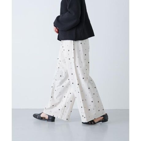 シンプルなトップスを合わせるだけでスタイリングが決まる一品。愛らしい刺繍生地が存在感を高めるイージーパンツです。程よい太さのストレートシルエットは、下半身のラインを拾いにくくスッキリとした印象に。BLACKは透け感が気にならず、IVORYには裏地が付いているので安心して着用いただけます。トップスとスカートもご用意しているのでぜひご覧ください。
