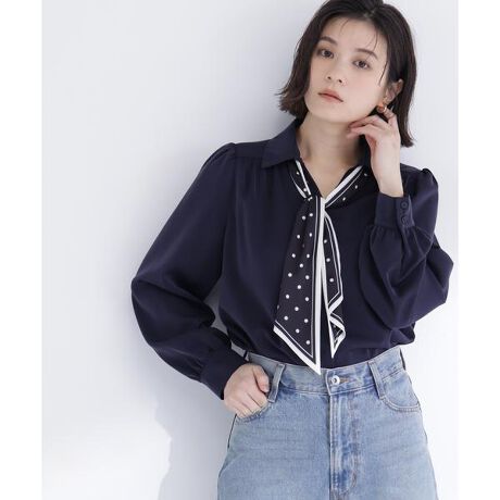 コーディネートの主役になるデザインスカーフ付きブラウス。ドット柄のスカーフが顔まわりを華やかに演出し、上品さの中に程よい遊び心をプラスします。スカーフは結び方次第で印象を変えられ、気分やシーンに合わせたアレンジが可能。一枚で完成度の高いスタイリングが叶うアイテムです。<素材>やや光沢感と落ち感のある生地を使用しています。<詳細>仕様・開閉なし裏地・なし透け感・ややあり / 光沢・ややあり / 伸縮性・なし生地の厚さ・普通※モデルの着用画像の場合、光の当たり具合により、実際の色味と異なって見えることがございます。色味は、商品単体の画像をご参照ください。