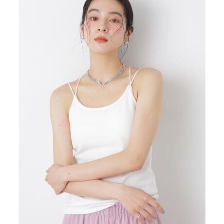 カップ付きで1枚で着られるブラいらずなキャミソール。デザイン性のあるダブルストラップが、羽織等からチラッと覗いた際に女性らしさを惹き立てます。透け感のあるシャツとレイヤードして合わせるコーディネートもおススメです。