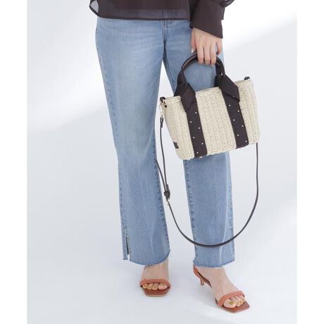 デイリーに使いやすい程よいサイズ感のバスケット型バッグ。ハンドルの結び目とドット状のマイクロスタッズが、程よい甘さと辛さのバランスを演出します。500mlのペットボトルや折りたたみ傘が横に収まるサイズ感で、中央はファスナー仕切りで防犯面も安心。スマートフォンや小物の収納に便利なオープンポケットも付いています。フェイクレザーのショルダーストラップは取り外し可能です。※モデルの着用画像の場合、光の当たり具合により、実際の色味と異なって見えることがございます。色味は、商品単体の画像をご参照ください。