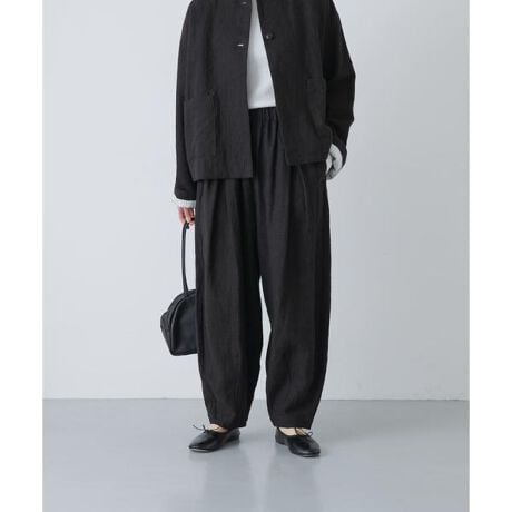 日々のコーデに頼もしく、着こなしに奥行きを生むイージーパンツ。ラミーのハリにリネンのしなやかさをブレンドし程よい柔らかさが特徴。時間をかけてじっくりと染め、生地に負担をかけないようにすることで風合い豊かな素材感に仕上がっています。フロントのクロスしたタックとコクーンシルエットがデザインポイント。同素材のジャケットとのセットアップコーデもおすすめです。